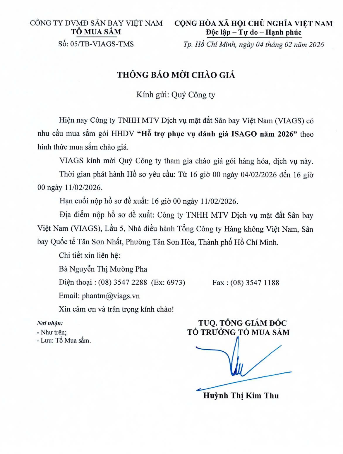 Thông báo mời chào giá gói HHDV: “Trang trí tòa nhà điều hành VIAGS, tòa nhà đa năng A41, Trung tâm đào tạo, phòng Briefing tổ bay, trang trí quầy và khu vực làm việc của VIAGS Tân Sơn Nhất đón Tết Nguyên đán 2026”