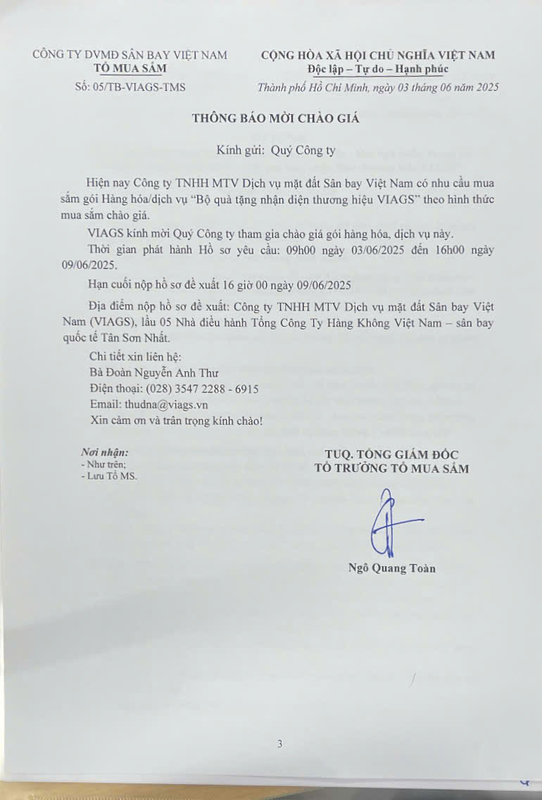 Thông báo mời chào giá gói HHDV: Quà tặng xúc tiến thương mại năm 2025 của VIAGS Nội Bài