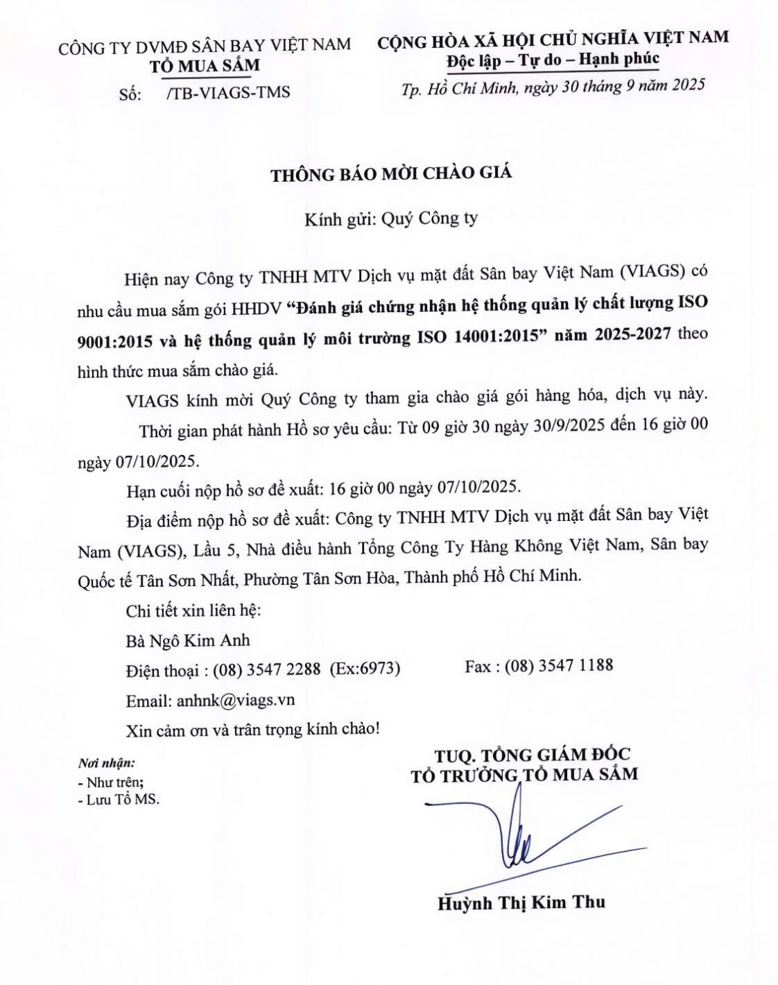 Thông báo mời chào giá gói HHDV: Hội nghị tổng kết cao điểm hè năm 2025 của VIAGS Nội Bài