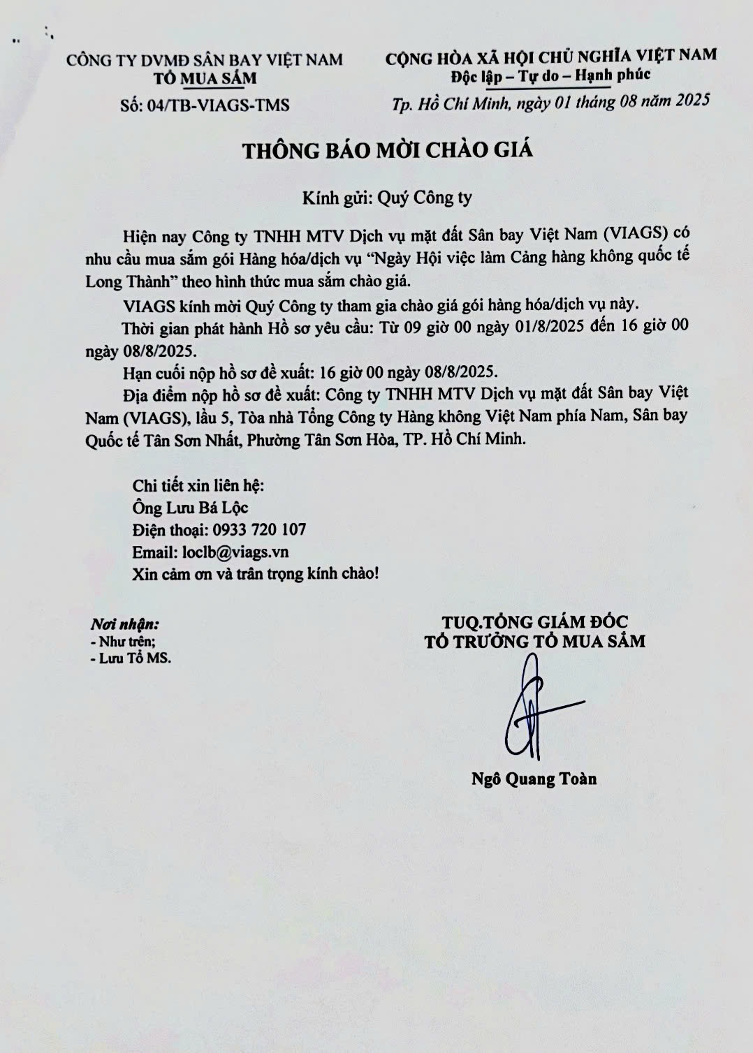 Thông báo mời chào giá gói HHDV: Ngày Hội việc làm Cảng hàng không quốc tế Long Thành
